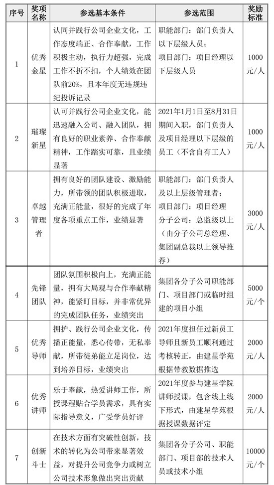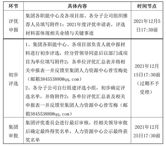 為弘揚(yáng)公司企業(yè)文化,認(rèn)真落實(shí)公司"勤勉誠(chéng)信、務(wù)實(shí)創(chuàng) 新、精益高效、共存共贏"的價(jià)值觀,表彰為集團(tuán)發(fā)展做出杰出 貢獻(xiàn)的優(yōu)秀團(tuán)體與個(gè)人,激發(fā)員工榮譽(yù)感與向上的動(dòng)力,表彰先進(jìn),樹立榜樣,集團(tuán)決定開展 2021 年度評(píng)優(yōu)工作,現(xiàn)將有關(guān)事項(xiàng)通知如下: