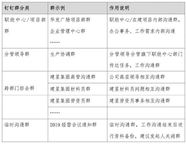 請公司各位負(fù)責(zé)人及同事于 2019 年 2 月 28 日前,關(guān)閉相關(guān)的 QQ 和微信工作群,在釘釘建立工作溝通群,逾期未進(jìn)行該項(xiàng)工作的人員將予以警告。原則上只允許存在一個中心職能部門群或項(xiàng)目部管理群;建立跨部門臨時群時,需按照誰主導(dǎo)誰發(fā)起的原則進(jìn)行建立臨時溝通群,事務(wù)溝通結(jié)束后,建議將相關(guān)文件資料進(jìn)行備份后解散關(guān)閉釘釘群;若是建立跨部門永久綜合溝通群,則以主管領(lǐng)導(dǎo)的身份進(jìn)行建立釘釘群,并制定好群規(guī),保證工作的有效溝通和效率。