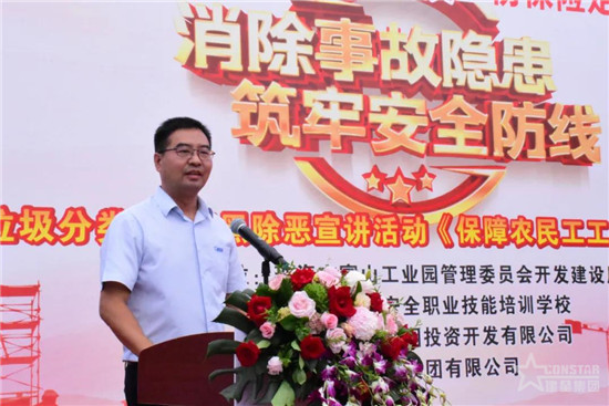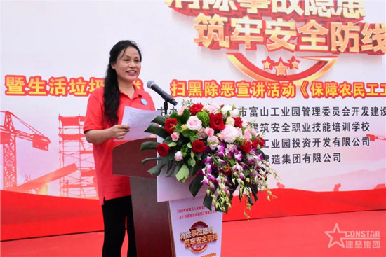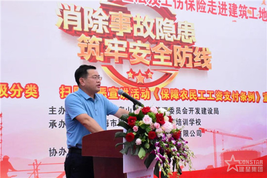 富山工業(yè)園管委會副主任張軍靈、安監(jiān)局局長嚴(yán)黨軍、開發(fā)建設(shè)局安監(jiān)站站長黃浩彬、珠海華金開發(fā)建設(shè)有限公司副總經(jīng)理朱佳富、珠海市建筑安全職業(yè)技能培訓(xùn)學(xué)校校長江春華、建星集團(tuán)副總裁黃鵬、集團(tuán)總裁助理兼安環(huán)管理中心總經(jīng)理郭定春出席活動。