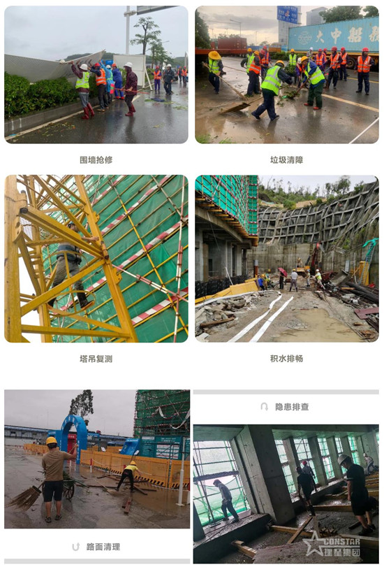 臺(tái)風(fēng)過(guò)境后。各項(xiàng)目受到不同程度的破壞,公司迅速組織災(zāi)后復(fù)產(chǎn)工作部署,對(duì)受損圍墻、安全網(wǎng)、電箱、辦公及生活板房等進(jìn)行維修;對(duì)垂直人貨梯、塔吊等復(fù)測(cè),以保證安全使用;對(duì)低洼積水排暢、路面垃圾清障、衛(wèi)生死角消殺。僅用半天時(shí)間,各項(xiàng)目部便恢復(fù)復(fù)工條件。