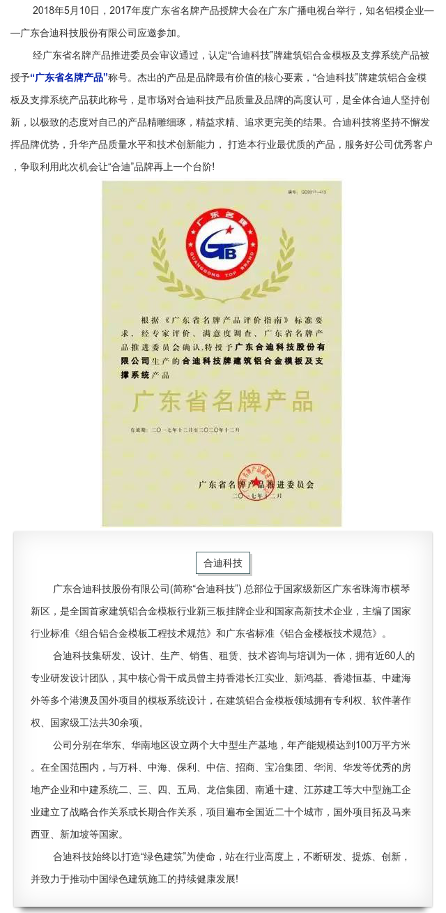 喜訊 | 合迪科技建筑鋁合金模板及支撐系統(tǒng)產(chǎn)品榮獲“廣東省名牌產(chǎn)品”