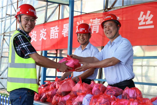華東區(qū)域總經(jīng)理王新志(右一)、安環(huán)管理中心總經(jīng)理郭定春(中)送清涼物資