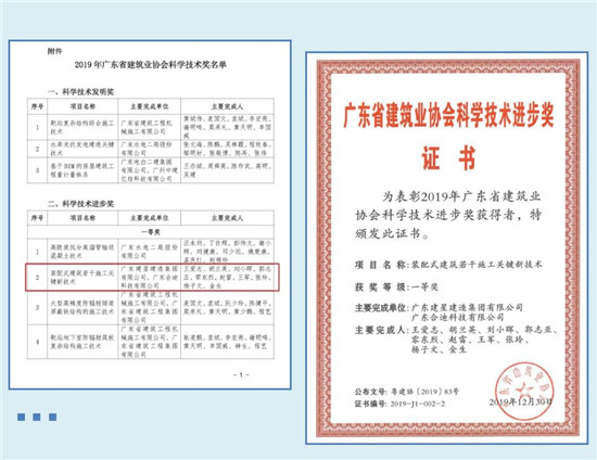 近日,廣東省建筑業(yè)協(xié)會頒發(fā)了“2019年廣東省建筑業(yè)協(xié)會科學(xué)技術(shù)獎”證書,建星集團完成的“裝配式建筑若干施工關(guān)鍵新技術(shù)”成果,榮獲科學(xué)技術(shù)進(jìn)步獎一等獎。