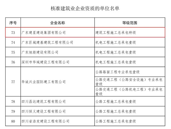 2020年12月31日,住房和城鄉(xiāng)建設(shè)部公布2020年第十批建設(shè)工程企業(yè)資質(zhì)名單,建星集團順利通過審核,晉升建筑工程施工總承包特級資質(zhì),成為我省近三年唯一一家獲得建筑工程總承包特級資質(zhì)的企業(yè)。目前,廣東省建筑業(yè)特級資質(zhì)數(shù)量增至31家。